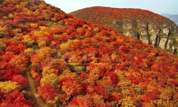 金秋十月,河北省邢台市沙河市册井镇西部山区的红叶迎来最佳观赏期,漫山红叶似火如霞,秋日美景使游客流连忘返。